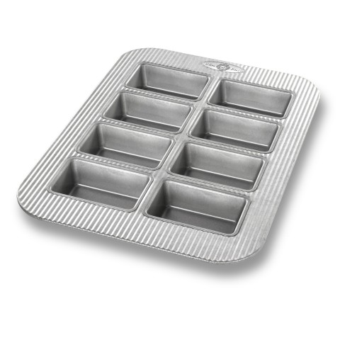 USA PAN® Mini-Loaf Pan, 11-1/8" x 15-3/4" overall, makes (8) 3-7/8" x 2" mini loaves, 5.1 oz. capacity each, curled rim, hand wash recommended, 22 gauge panel/26 gauge cups, aluminized steel, AMERICOAT® ePlus silicone glaze, PFOA free, made in the USA with global materials