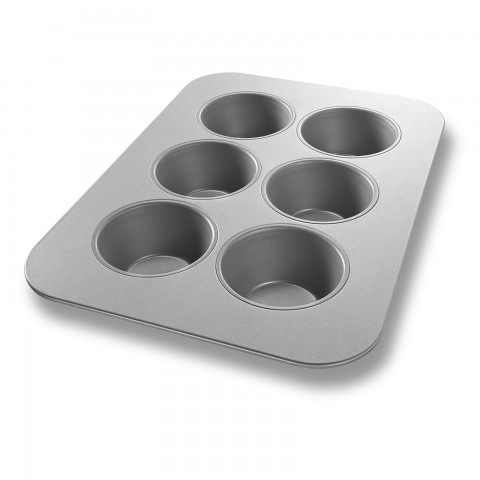 Pecan Roll/Large Muffin Pan, 11-1/8" x 15-3/4" overall, makes (6) 3-11/16" dia. mini-swirl cakes, 8.2 oz. capacity each, curled rim, hand wash recommended, 22 gauge panel/26 gauge cups, aluminized steel, AMERICOAT® ePlus silicone glaze, PFOA free, made in the USA with global materials