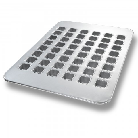 Brownie Bite Pan, 17-7/8" x 25-7/8" overall, makes (48) 1-21/32" square brownies, 2.2 oz. capacity each, wire in rim, hand wash recommended, 26 gauge aluminized steel, AMERICOAT® ePlus silicone glaze, PFOA free, made in the USA with global materials
