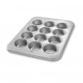 Large Muffin Pan, 12-7/8" x 17-7/8" overall, makes (12) 3-1/4" dia. muffins, 5 oz. capacity each, wire in rim, hand wash recommended, 26 gauge aluminized steel, AMERICOAT® ePlus silicone glaze, PFOA Free, made in the USA with global materials