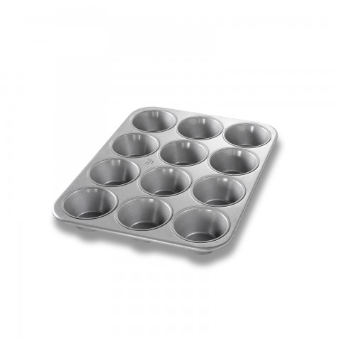 Pecan Roll/Large Muffin Pan, 13-1/2" x 17-7/8" overall, makes (12) 3-11/16" dia. muffins, 8.2 oz. capacity each, wire in rim, hand wash recommended, 26 gauge aluminized steel, AMERICOAT® ePlus silicone glaze, PFOA Free, made in the USA with global materials