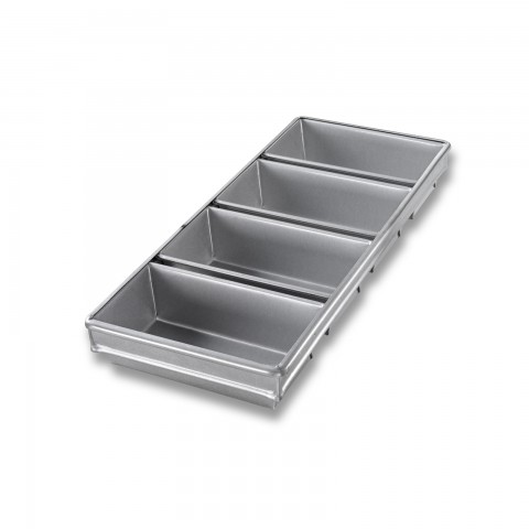 Bread Pan Set, 4-pan, 9-7/32" x 21-7/8" x 2-3/4" overall, (4) 8-1/2" x 4-1/2" strapped pans, wire in rim, band over wire, folded construction, hand wash recommended, 26 gauge aluminized steel, AMERICOAT® ePlus silicone glaze, PFOA Free, made in the USA with global materials