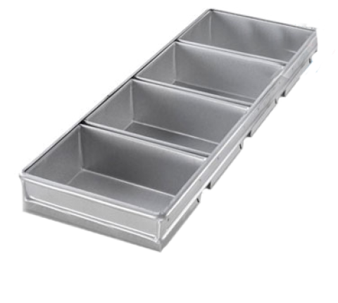 Bread Pan Set, 4-pan, 9-3/16" x 26" x 3" overall, (4) 8-1/2" x 5-3/4" strapped pans, wire in rim, band over wire, folded construction, hand wash recommended, 26 gauge aluminized steel, AMERICOAT® ePlus silicone glaze, PFOA Free, made in the USA with global materials