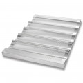 Baguette Pan, 17-3/4" x 25-3/4" x 1" overall, makes (5) 3-7/8" x 17-3/4" loaves, .081 dia. perforations, open ends, welded, hand wash recommended, 16 gauge aluminum, AMERICOAT® ePlus silicone glaze, PFOA Free, made in the USA with global materials