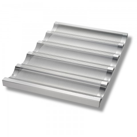 Uni-Lock® Baguette/French Bread Pan, 17-3/4" x 25-3/4" x 1" overall, makes (5) 3-7/8" x 17-3/4" loaves, .081" dia. perforations, open ends, hand wash recommended, 16 gauge aluminum, AMERICOAT® ePlus silicone glaze, PFOA Free, made in the USA with global materials