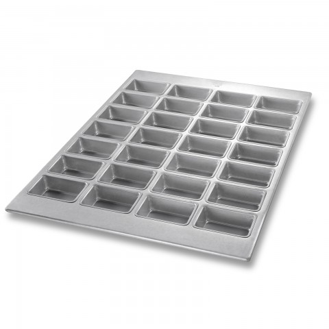 Mini Loaf Pan, 18-7/8" x 25-7/8" overall, makes (28) 3-7/8" x 2-1/2" loaves, 6.4 oz. capacity each, wire in rim, hand wash recommended, 26 gauge aluminized steel, AMERICOAT® ePlus silicone glaze, PFOA Free, made in the USA with global materials