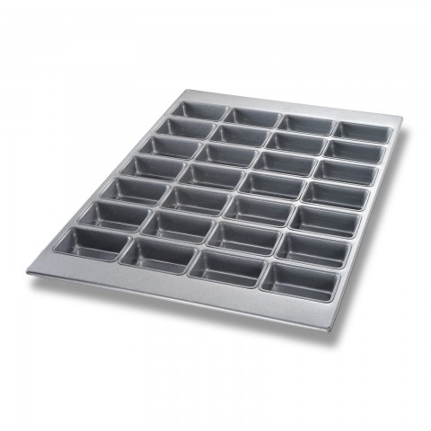 Mini Loaf Pan, 17-7/8" x 25-7/8" overall, makes (28) 3-7/8" x 2-1/2" loaves, 6.4 oz. capacity each, wire in rim, hand wash recommended, 26 gauge aluminized steel, AMERICOAT® ePlus silicone glaze, PFOA Free, made in the USA with global materials