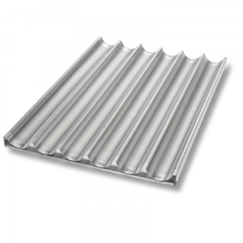Uni-Lock® Baguette/French Bread Pan, 17-3/4" x 25-3/4" x 1" overall, makes (6) 2-7/16" x 25-3/4" loaves, open ends, .081" dia. perforations, hand wash recommended, 16 gauge aluminum, AMERICOAT® ePlus silicone glaze, PFOA Free, made in the USA with global materials