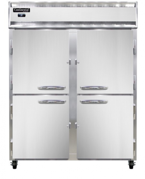 Extra-Wide Refrigerator, 52 cu. ft. capacity, pass-thru, 57" wide two-section, self-contained refrigeration, standard depth, half-height solid doors on front, half-height glass doors on rear, electronic controller with digital display, electric condensate evaporator, stainless steel exterior, aluminum interior, 5" casters, NEMA-5-15P, 1/2 HP, cETLus, NSF, Made in the USA