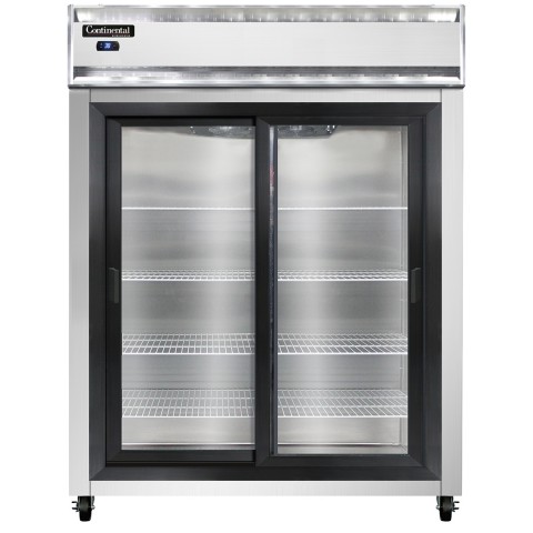 Extra-Wide Refrigerator, reach-in, 57"W, two-section, self-contained refrigeration, aluminum exterior & interior, stainless steel front, shallow depth, full-height sliding glass doors, cylinder locks, electronic control with digital display, hi-low alarm, R290 Hydrocarbon refrigerant, 1/3 HP, cETLus, NSF