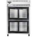 Refrigerator, reach-in display, two-section, self-contained refrigeration, aluminum exterior & interior, stainless steel front, shallow depth, narrow sliding glass half doors, cylinder locks, electronic control with digital display, hi-low alarm, R290 Hydrocarbon refrigerant, 1/3 HP, cETLus, NSF