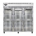 Freezer, display, three-section, self-contained refrigeration, stainless steel exterior, aluminum interior, standard depth, narrow hinged glass half doors, cylinder locks, electronic control with digital display, hi-low alarm, electric condensate evaporator, R290 Hydrocarbon refrigerant, 1-1/4 HP, cETLus, NSF