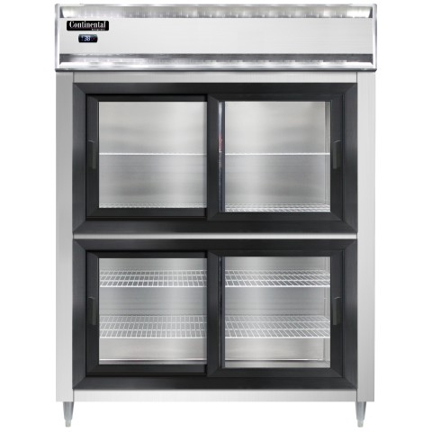 Designer Line Wide Refrigerator, reach-in, 57"W, two-section, self-contained refrigeration, aluminum exterior & interior, stainless steel front, standard depth cabinet, wide half-height sliding glass doors, cylinder locks, electronic control with digital display, hi-low alarm, 6" stainless steel legs, R290 Hydrocarbon refrigerant, 1/3 HP, cETLus, NSF