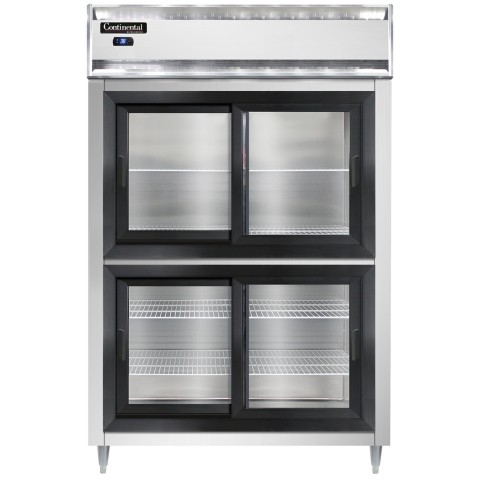 Designer Line Refrigerator, reach-in, two-section, self-contained refrigeration, stainless steel exterior, aluminum interior, shallow depth cabinet, half-height sliding glass doors, cylinder locks, electronic control with digital display, hi-low alarm, 6" stainless steel legs, R290 Hydrocarbon refrigerant, 1/3 HP, cETLus, NSF