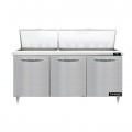 Designer Line Mighty Top Sandwich Unit, 72"W, three-section, (30) 1/6 size x 4" deep pans with 8" cutting board, (3) field rehingeable doors, stainless steel top, front, sides & interior, electronic control with digital display, hi-low alarm, 6" adjustable legs, rear mounted self-contained refrigeration, automatic hot gas condensate evaporator, R290 hydrocarbon refrigerant, 1/3 HP, cETLus, NSF