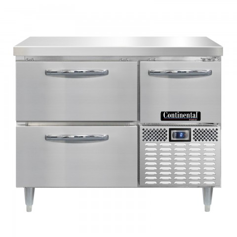 Designer Line Freezer Base Worktop Unit, 43"W, reinforced stainless steel work top, stainless steel exterior, front, sides & interior, (2) drawers & (1) half height field rehingeable door, 6" adjustable stainless steel legs, electronic control with digital display, hi-low alarm, R290 hydrocarbon refrigerant, 1/4 HP, side-mounted refrigeration, cETLus, NSF