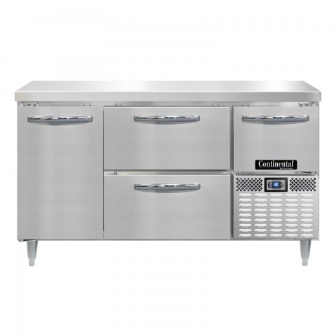 Designer Line Refrigerated Base Worktop Unit, 60"W, reinforced stainless steel work top, stainless steel exterior, front, sides & interior, (2) drawers hold (2) 12 x 20 x 6 pans per drawer (supplied by others), (2) narrow drawers hold (1) 12 x 20 x 6 pan per drawer (supplied by others) & (1) half height field rehingeable door, 6" adjustable stainless steel legs, electronic control, off-cycle defrost, 1/4 HP, side-mounted refrigeration, R290 hydrocarbon refrigerant, cETLus, NSF