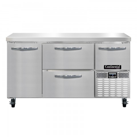 Freezer Base Worktop Unit, 60"W, 300 series stainless steel flat work top, stainless steel front & end panels, galvanized steel rear & grill, aluminum interior, (2) drawers hold (2) 12 x 20 x 6 pans per drawer (supplied by others), (2) narrow drawers hold (1) 12 x 20 x 6 pan per drawer (supplied by others) & (1) half height field rehingeable door, electronic control, off-cycle defrost, 1/2 HP, R290 hydrocarbon refrigerant, side-mounted refrigeration, cETLus, NSF