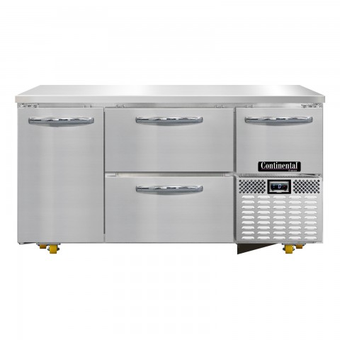 Undercounter Freezer Base, 60"W, stainless steel front & end panels, stainless steel top, aluminum interior, (2) drawers hold (2) 12 x 20 x 6 pans per drawer (supplied by others), (2) narrow drawers hold (1) 12 x 20 x 6 pan per drawer (supplied by others) & (1) half height field rehingeable door, electronic control, off-cycle defrost, (8) 1-3/8" diameter plate casters mounted on heavy-duty support plates (easily field installed), 1/2 HP, R290 hydrocarbon refrigerant, front breathing, side-mounted refrigeration, cETLus, NSF