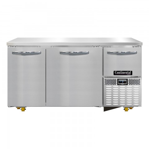 Undercounter Freezer Base, 60"W, stainless steel front & end panels, stainless steel top, aluminum interior, (2) full & (1) half height field rehingeable doors, electronic control, off-cycle defrost, (8) 1-3/8" diameter plate casters mounted on heavy-duty support plates (easily field installed), 1/2 HP, R290 hydrocarbon refrigerant, front breathing, side-mounted refrigeration, cETLus, NSF