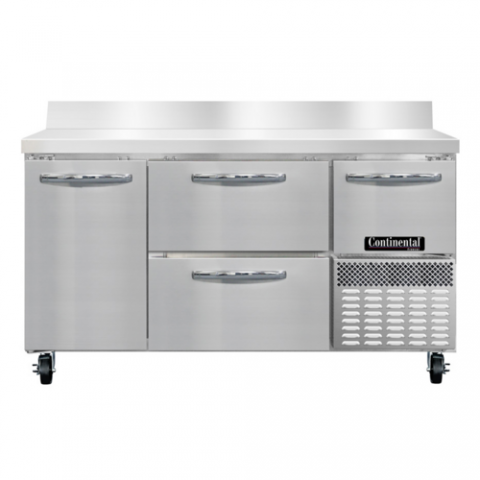 Freezer Base Shallow Depth Worktop Unit, 60"W, 300 series stainless steel work top with 6"H backsplash, stainless steel front & end panels, galvanized steel rear & grill, aluminum interior, (2) drawers hold (1) 12 x 20 x 6 pans per drawer (supplied by others), (2) narrow drawers hold (4) 6 x 6 2/3 x 6 pan per drawer (supplied by others) & (1) half height field rehingeable door, electronic control, off-cycle defrost, 1/2 HP, R290 hydrocarbon refrigerant, side-mounted refrigeration, cETLus, CE, NSF