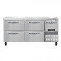Freezer Base Shallow Depth Worktop Unit, 68"W, 300 series stainless steel flat work top, stainless steel front & end panels, galvanized steel rear & grill, aluminum interior, (4) drawers hold (1) 12 x 20 x 6 pans per drawer (supplied by others), (1) half height field rehingeable door, electronic control, off-cycle defrost, 1/2 HP, R290 hydrocarbon refrigerant, side-mounted refrigeration, cETLus, NSF