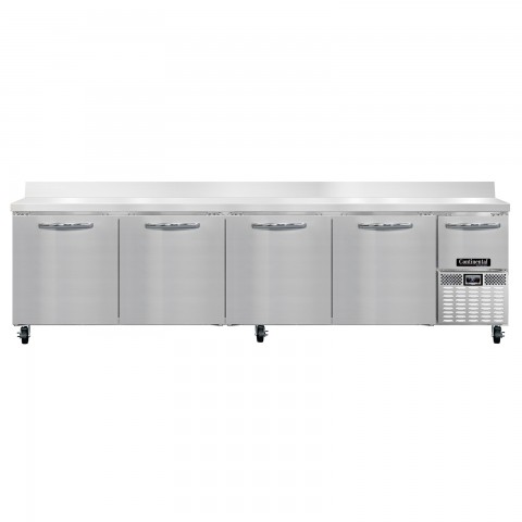 Refrigerated Base Worktop Unit, 118"W, 300 series stainless steel work top with 6"H backsplash, stainless steel front & end panels, galvanized steel rear & grill, aluminum interior, (4) full & (1) half height field rehingeable doors, electronic control, off cycle defrost, R290 Hydrocarbon refrigerant, 1/4 HP, side-mounted refrigeration, cETLus, NSF, ENERGY STAR®