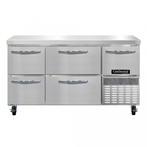 Refrigerated Base Shallow Depth Worktop Unit, 60"W, 300 series stainless steel flat work top, stainless steel front & end panels, galvanized steel rear & grill, aluminum interior, (2) drawers hold (1) 12 x 20 x 6 pans per drawer (supplied by others), (2) narrow drawers hold (4) 6 x 6 2/3 x 6 pan per drawer (supplied by others) & (1) half height field rehingeable door, electronic control, off cycle defrost, 1/4 HP, side-mounted refrigeration, R290 hydrocarbon refrigerant, cETLus, NSF