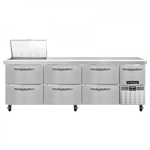 Refrigerated Base Sandwich Unit, 93"W, 300 series stainless steel (Mighty) top with (12) 1/6 size x 4" deep pans, stainless steel front & sides, galvanized steel case back, aluminum interior, 10" deep nylon cutting board, (6) drawers - top drawers hold (1) 12" x 20" (3) 1/6 pans each & Bottom drawers holds (2) 12" x 20" pans each, (1) half height field rehingeable door, electronic control, off cycle defrost, hot gas condensate evaporator, 1/3 HP, side-mounted refrigeration, R290 Hydrocarbon refrigerant, cETLus, NSF