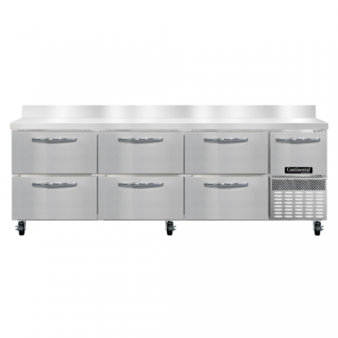 Refrigerated Base Shallow Depth Worktop Unit, 93"W, 300 series stainless steel work top with 6"H backsplash, stainless steel front & end panels, galvanized steel rear & grill, aluminum interior, (6) drawers hold (1) 12 x 20 x 6 pans per drawer (supplied by others), (1) half height field rehingeable door, electronic control, off cycle defrost, 1/4 HP, side-mounted refrigeration, R290 hydrocarbon refrigerant, cETLus, NSF