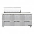 Mighty Top Sandwich Unit, 72"W, 20.6 cu ft capacity, three-section, (18) 1/6 size x 4" deep pans with 8" cutting board, (6) drawers, accommodates (1) 12 x 18 x 6 pan per drawer or (1) 1/2 x 6 & (1) 1/3 x 6 pans per drawer (supplied by others), stainless steel top, front & end panels, aluminum back & interior, rear mounted self-contained refrigeration, automatic hot gas condensate evaporator, R290 hydrocarbon refrigerant, 1/3 HP, cETLus, NSF