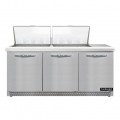 Mighty Top Sandwich Unit, Front Breather, 72"W, 20.6 cu ft capacity, three-section, (24) 1/6 size x 4" deep pans with 8" cutting board, (3) field rehingeable doors, stainless steel top, front & end panels, aluminum back & interior, 3-3/4" casters, rear mounted self-contained refrigeration, automatic hot gas condensate evaporator, R290 hydrocarbon refrigerant, 1/3 HP, cETLus, NSF