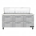 Mighty Top Sandwich Unit, 72"W, 20.6 cu ft capacity, three-section, (27) 1/6 size x 4" deep pans with 8" cutting board, (6) drawers, accommodates (1) 12 x 18 x 6 pan per drawer or (1) 1/2 x 6 & (1) 1/3 x 6 pans per drawer (supplied by others), stainless steel top, front & end panels, aluminum back & interior, rear mounted self-contained refrigeration, automatic hot gas condensate evaporator, R290 hydrocarbon refrigerant, 1/3 HP, cETLus, NSF