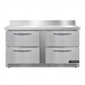 Work Top Freezer, Front Breather, 60"W, 17.0 cu ft capacity, two-section, stainless steel top with 5-1/2"H backsplash, (4) drawers, accommodates (1) 12x20x6 pan per drawer (supplied by others), stainless steel front & end panels, aluminum interior, 3-3/4" casters, rear mounted self-contained refrigeration, R290 Hydrocarbon refrigerant, 1/2 HP, cETLus, NSF