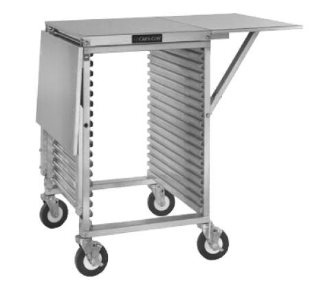 Mobile Work Stand, self contained work center/station for small appliances, solid top model features side drop shelves with snap-lock system, holds (18) 18" x 26" pans, 1-1/2" centers, aluminum frame, NSF