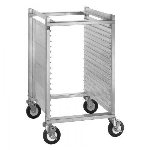 Utility Rack, mobile, half-size, closed sides, extruded interlocking side walls act as pan slides on 1-1/2" centers, accepts 18" x 26" pans or plastic food boxes, 15 pan capacity, fully welded Hi-Tensile aluminum frame construction, (4) 3" swivel casters (2) braked, NSF