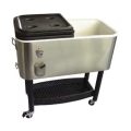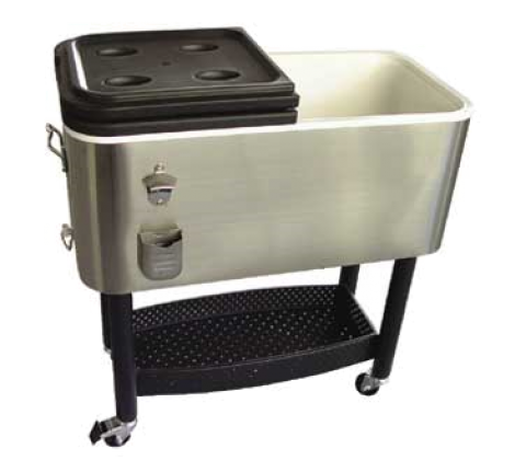 Garden Cooler, 17 gallon, 31"L x 15-1/4"W x 13-1/4"H (34"H on stand), folding plastic middle lid, stainless steel casing, powder coated iron base, (4) 4" commercial wheels (2 with locks)