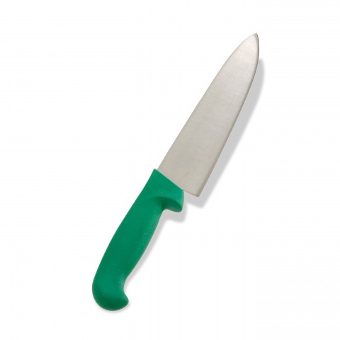 Cook's Knife, 8", high carbon German steel blade, polypropylene handle, green, NSF (clam pack for display)