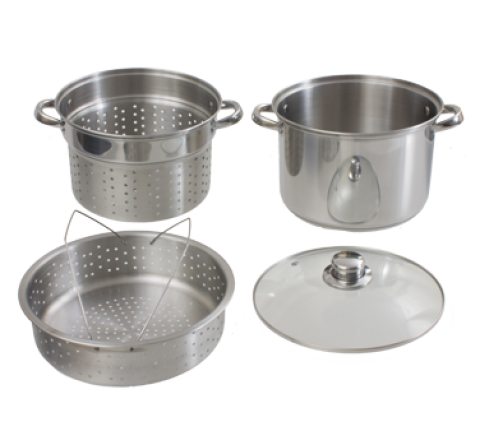Pasta & Steamer Pot, 8 qt. capacity, .5mm satin interior, mirror polish exterior, aluminum capsule bottom 1.5mm, stainless steel hollow handle, straight shape, step & roll edge, includes: pot, pasta insert, glass lid with round knob, and steamer basket, 430 18/0 stainless steel