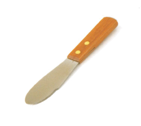 Spreader, 3-3/4" blade, 6" OA, round end, serrated, stainless steel blade, wood handle