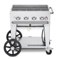 Mobile Outdoor Charbroiler, LP gas, 38"L x 28"D, 28" x21" grill area, 4 burners, 304 stainless steel construction, stainless steel grill, radiants, lighter tube (pilot), undershelf, legs & water pan, includes hose & regulator, (2) 14" wheels & (2) total l