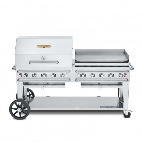 Pro Series Grill, LP gas, 81"L x 28"D, 10 burners, single inlet (gas hose included) with roll dome and Pro Griddle Package, stainless steel construction, stainless steel grill, radiants, undershelf & legs, (2) 14" wheels & (2) total lock casters, (Single Inlet NGH05 gas hose included; use this model with 50 lb. or 100 lb. LP tanks only)