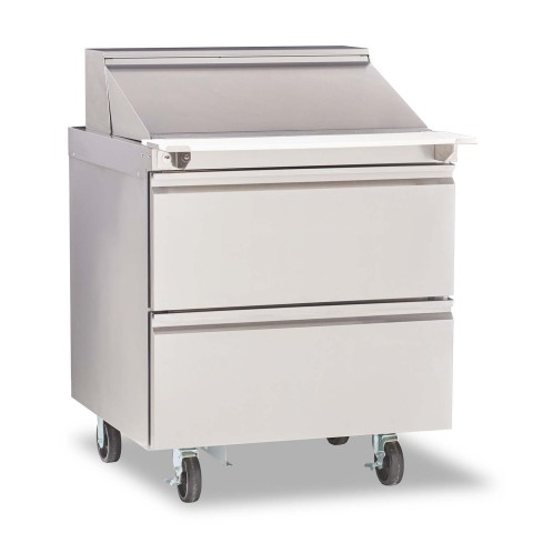 Mega Top Refrigerator, single-section, 32" W, 10.10 cubic feet, (2) drawers, stainless steel top with polyethylene cutting board & (12) 1/6 size plastic pans, ABS interior sides, stainless steel front & sides, 5" casters, front-breathing rear-mounted refrigeration system, R290 Hydrocarbon refrigerant, 0.3 hp, cUL, UL, NSF