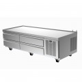 Refrigerated Low-Profile Equipment Stand, 75-1/4"W x 31-47/50"D x 24"H, two-section, (4) drawers (pans not included), stainless steel top & drawer fronts, front non-spill edge, ABS interior sides, 4" casters, side-mounted refrigeration system with electric condensate evaporator, R290 Hydrocarbon refrigerant, 1/4 hp, cUL, UL, NSF