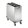 Mobile Cup Dispensing Cart, 35”H x 17-1/2”W x 33”D, interchangeable silicone gaskets, (8) SLR-2L cup dispensers, accommodates 8 oz. to 44 oz. cups with rim dia. 3"- 4-1/2", stainless steel cabinet with ABS plastic cup dispensers, removable bumper guards, recessed handles, (4) pre-installed swivel casters with locks, NSF cup dispensers