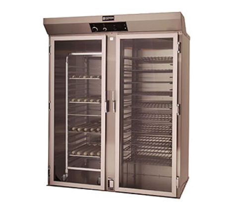 Proofer Cabinet, roll-in, two-section, capacity one single rack on one side and (10) shelves with 2-1/2" centers on the other side, solid state heat/humidity controls, auto. water entry, full view glass doors, stainless steel interior and exterior, aluminum floor