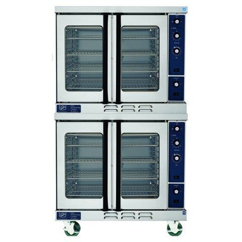 Convection Oven, gas, double-deck, standard depth, with 8" stainless steel legs & adjustable stainless steel feet, feet, 50/50 stainless steel independent doors, (2) windows, (6) racks & (13) rack positions per deck, porcelain interior, mech. snap action thermostat (200°-500°F), 60 minute dial timer with buzzer & (2) speed fan, NSF, CSA Star, CSA Flame