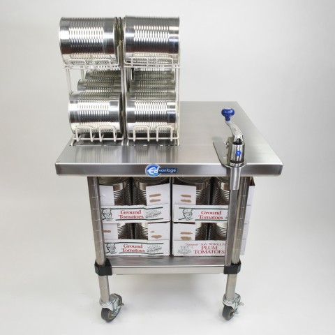 Can Opening Station, mobile, 24"W x 24"D x 34"H, S-11 can opener, (2) top-mounted can racks hold up to (8) cans each (16 total #10 cans), 500 lb. capacity lower shelf holds up to (6) cases of additional cans, locking casters, stainless steel, Made in USA