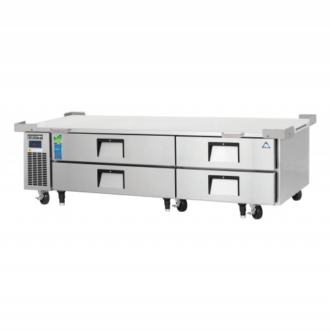Chef Base Refrigerator, two-section, 86-1/4"W, self-contained side mounted refrigeration, (4) heavy duty stainless steel drawers, 1,084 lbs. weight capacity, 16 gauge stainless steel worktop, digital controls with LED display, auto defrost, dual air chamber & vents, high heat insulation, stainless steel grips, worktop security corner guards, stainless steel interior & exterior, galvanized steel bottom & rear, (3) leg stabilizers, (6) 5" swivel casters (3 locking), R290 Hydrocarbon refrigerant, 1/3 HP, 115v/60/1-ph, 2.0 amps, cord, NEMA 5-15P, NSF, cETLus, ETL-Sanitation