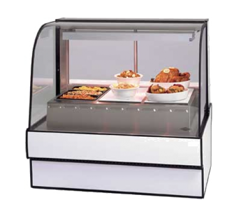 Curved Glass Hot Deli Case, 50.13"W x 35.31"D x 48”H, wet or dry heat, (3) wells, independently controlled stainless steel heating wells each with a calrod heating element, top-mounted full-length infrared heater, curved thermopane tilt-front glass, forced air front-glass defogger, LED top light, glass sliding rear doors with moisture vents, stainless steel deck, tempered glass ends, removable wrapping board, designed for continuous lineups, choice of laminate, black trim, drain not needed, UL, UL EPH CLASSIFIED